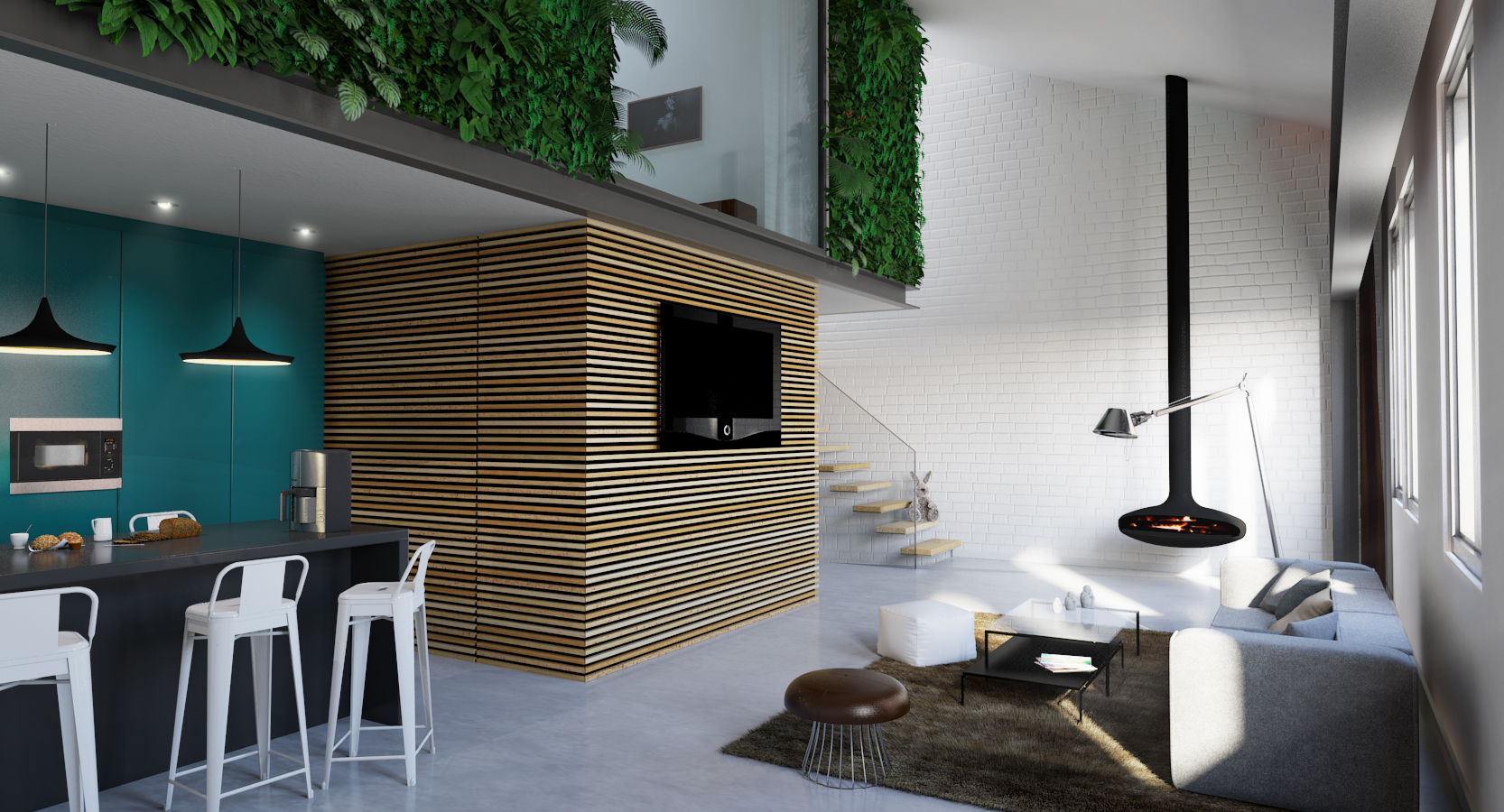 Le second loft n’a pas d’espace extérieur. Il est organisé en triplex. Un mur végétalisé est positionné sur le dernier niveau du projet en surplomb du séjour, véritable poumon vert de l’appartement. Les matériaux contrastent avec le premier, mais la chaleur des lieux est conservée. Le bois, le béton, le métal et le verre définissent le caractère du loft.