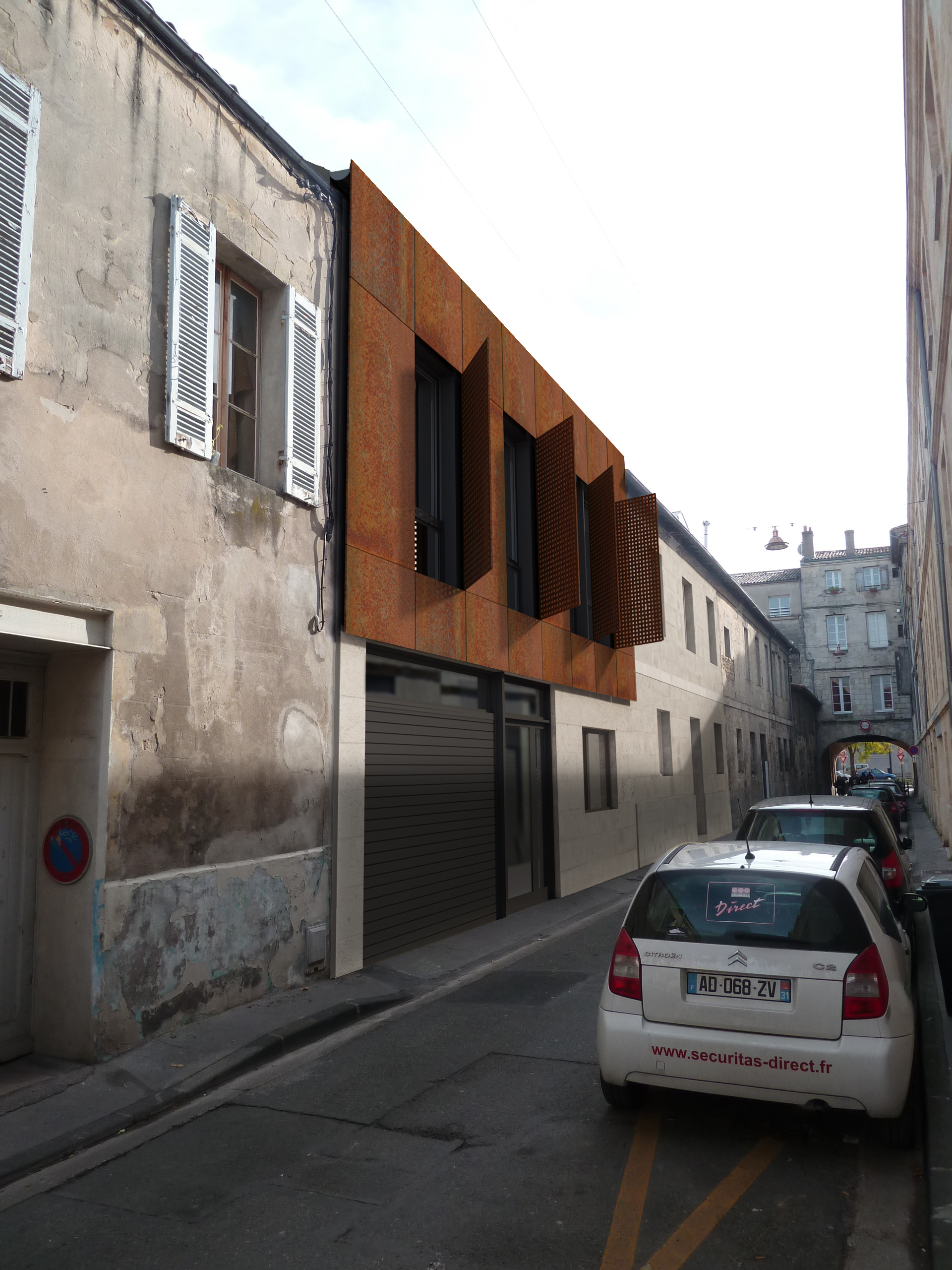 Le parti pris du projet est la création dans la dent creuse d’une séquence sur voie contemporaine. La façade est habillée de plaque d’acier corten. Des plaques perforées sont positionnées au droit des ouvertures afin de garantir l’intimité des occupants et leur permettre également une gestion des apports solaires. Le reste de la façade est habillée de pierre pour s’intégrer à l’environnement. La partie existante du chai est ravalée et remise en état.