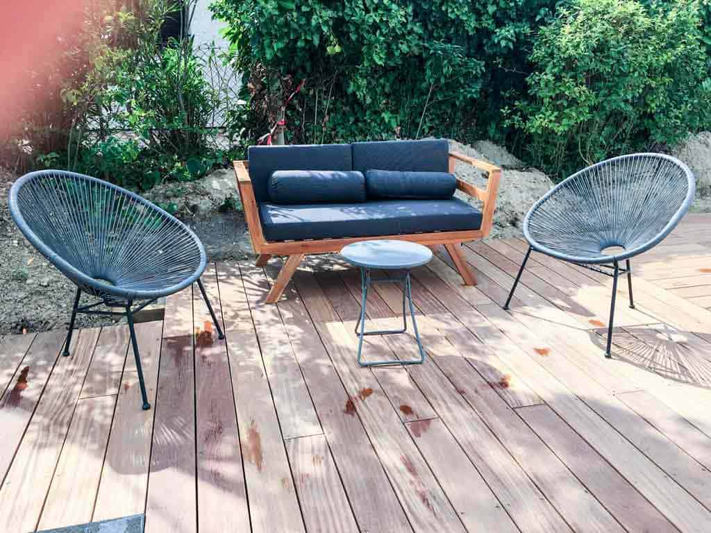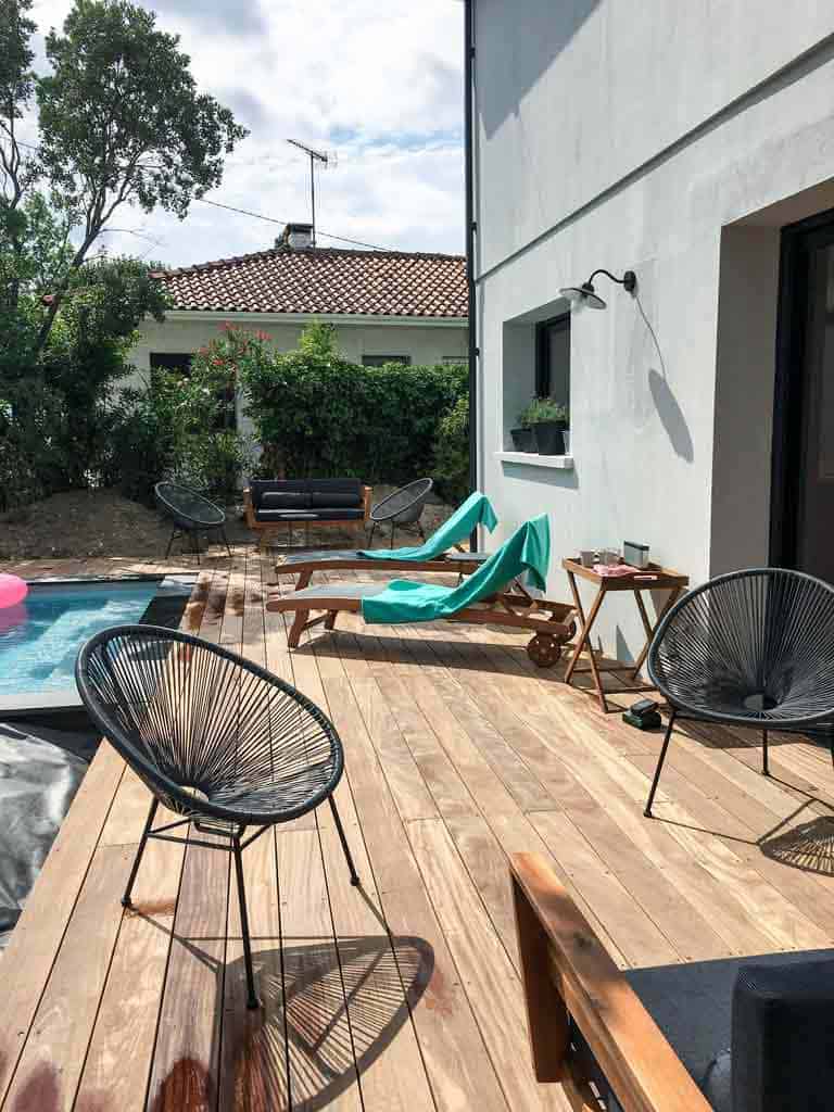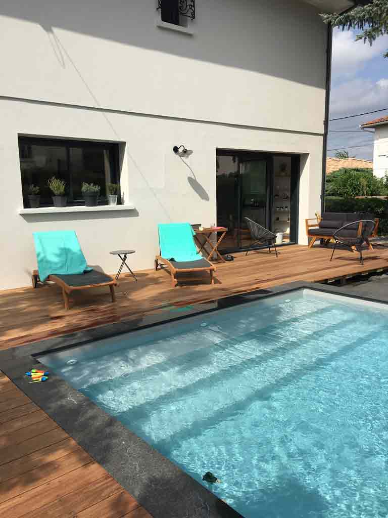 Une piscine est positionnée dans le prolongement du séjour avec sa terrasse.