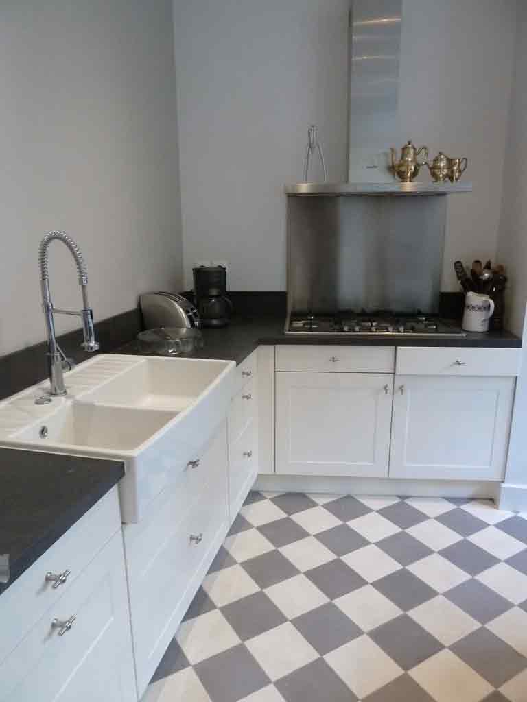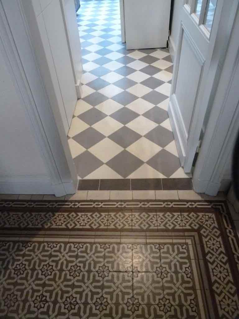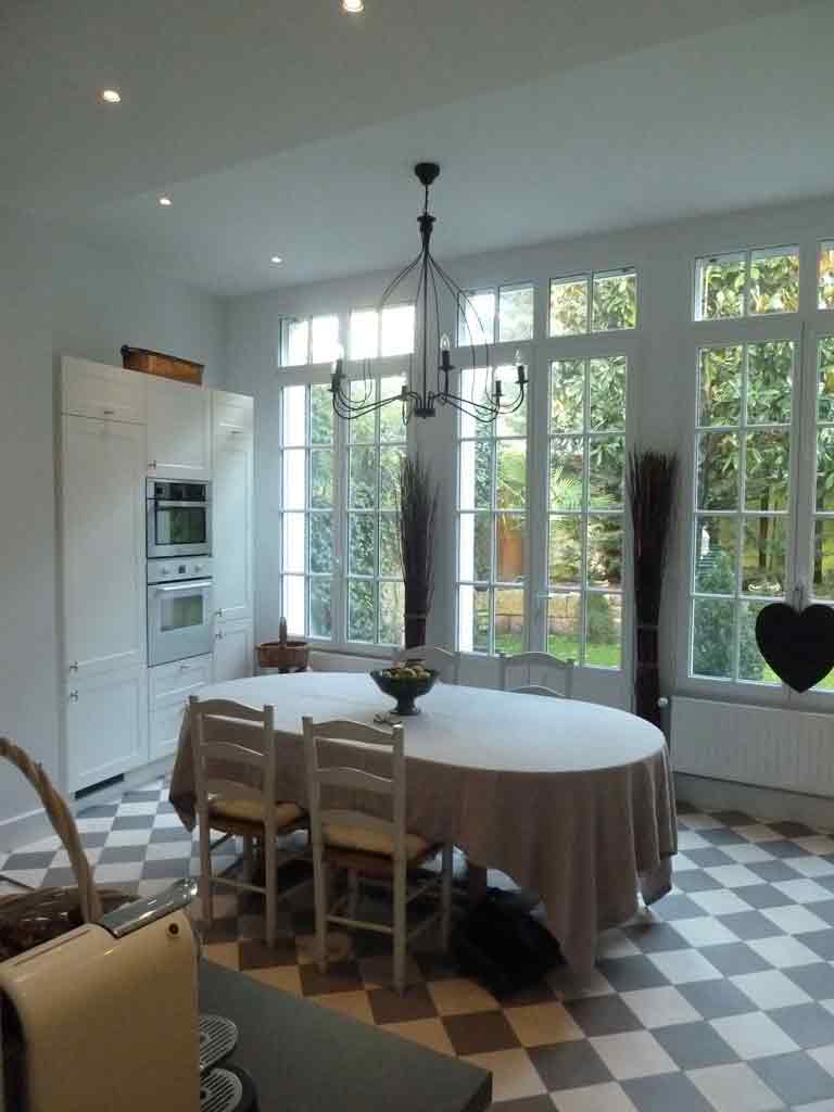 Un damier de carreaux de ciment est posé au sol pour une intégration parfaite de l’extension à la maison d’origine.